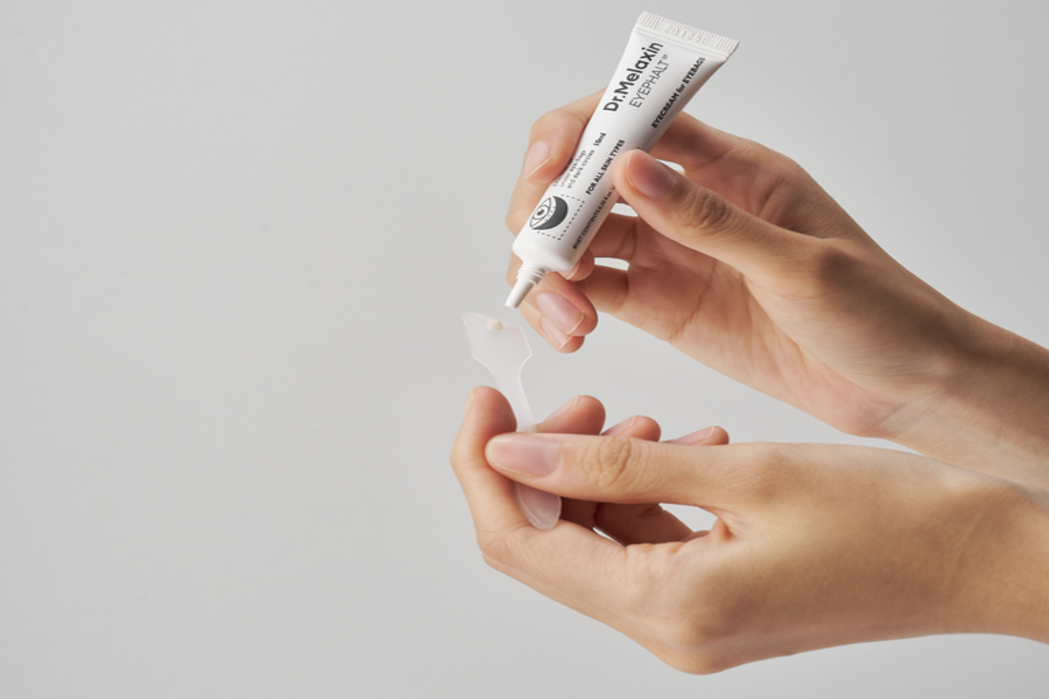 1. Squeeze a rice grain sized amount onto the spatula and apply on the eye bag area.