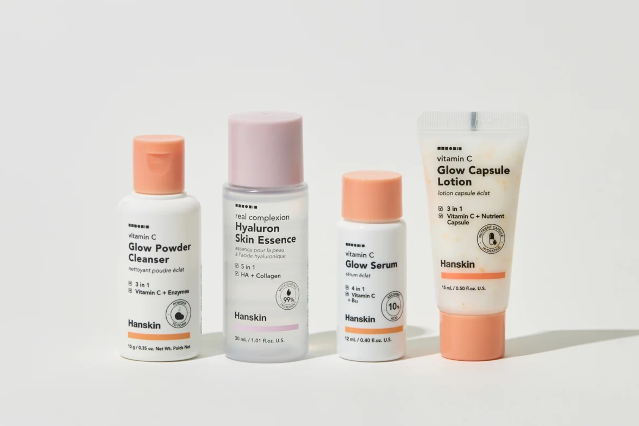 Vitamin c glow powder cleanser, hyaluron skin essence. vitamin c glow serum, vitamin c glow capsule lotion